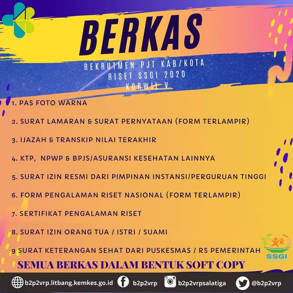 Open Recruitment PJT Kabupaten/Kota Riset Studi Status Gizi Indonesia (SSGI) Tahun 2020 Koordinator Wilayah V Balai Besar Penelitian dan Pengembangan Vektor dan Reservoir Penyakit telah dibuka. Untuk Pendaftaran bisa di klik DISINI.