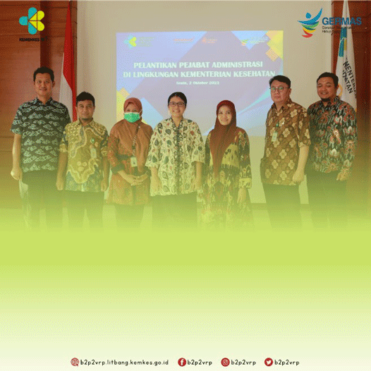 Fery Jelitawati, SE, M.Kes, M.M dilantik sebagai kasubbag adum B2P2VRP bersama 2 orang lainnya dari Badan Kebijakan Pembangunan Kesehatan, yaitu Anif Budiyanto, SKM, M.Epid sebagai Kepala Balitbang Kesehatan Baturaja dan Siti Nurjanah, SKM sebagai Kasubbag Adum Balitbang Kesehatan Magelang. Dalam sambutan Sekretaris Jenderal, Kunta Wibawa Dasa Nugraha S.E., M.A., Ph.D yang diwakili oleh Kepala Dirjen P2P, beliau menyampaikan agar pejabat yang baru saja dilantik dapat bekerja secara optimal, segera beradaptasi menyesuaikan diri dengan lingkungan kerja baru, dan tentu saja melaksanakan setiap tantangan dan tanggung jawab yang diberikan dengan sebaik – baiknya. (APP/B)